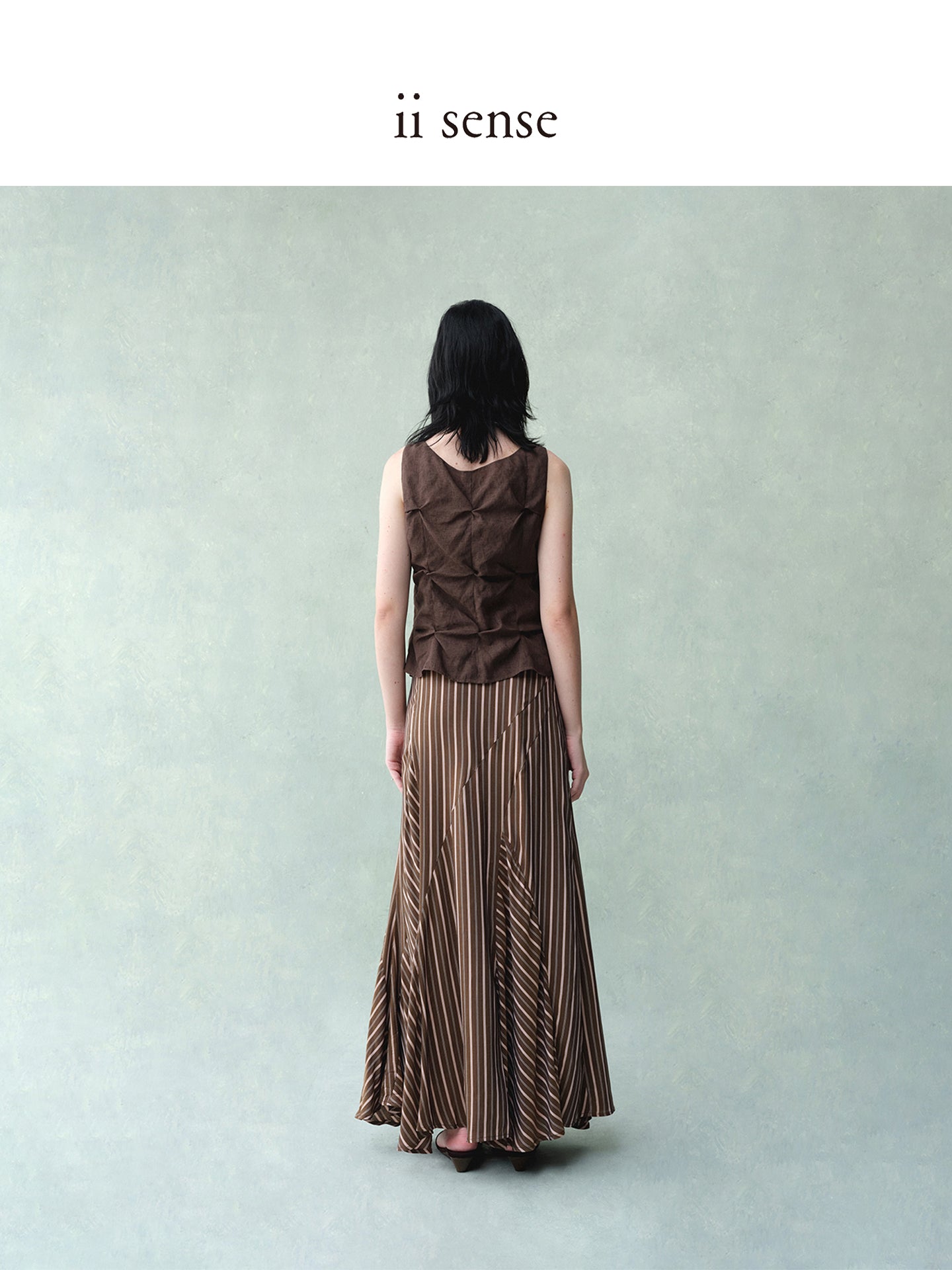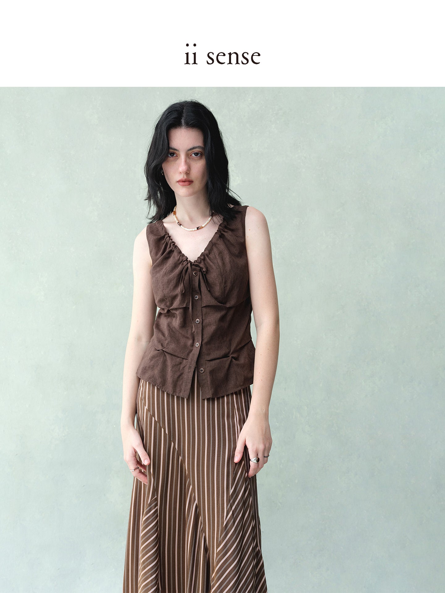 With its soft twisted drape and V-neck tie, this vest in lightweight Japanese fabric evokes a sense of fluid ease and graceful nonchalance.