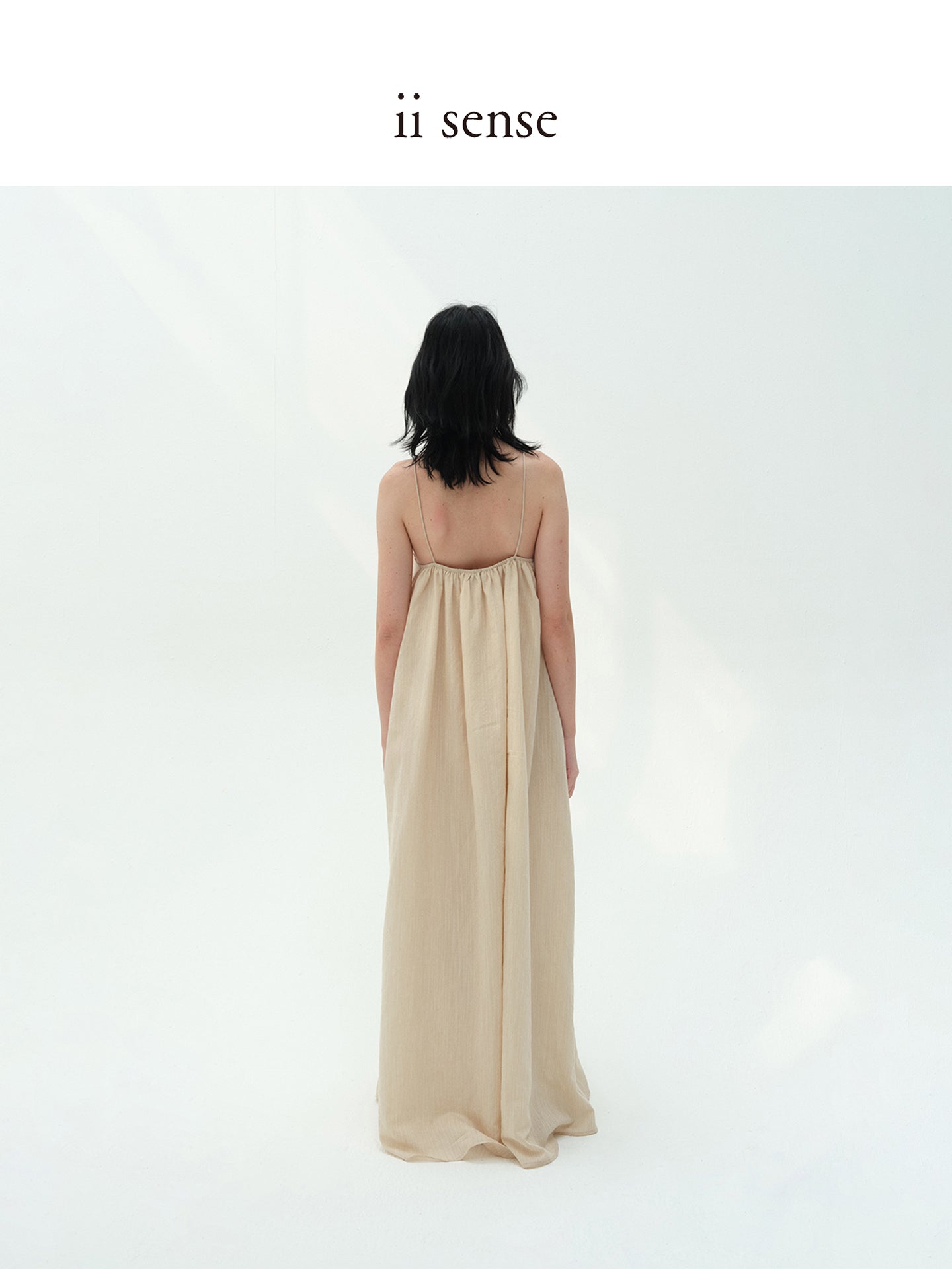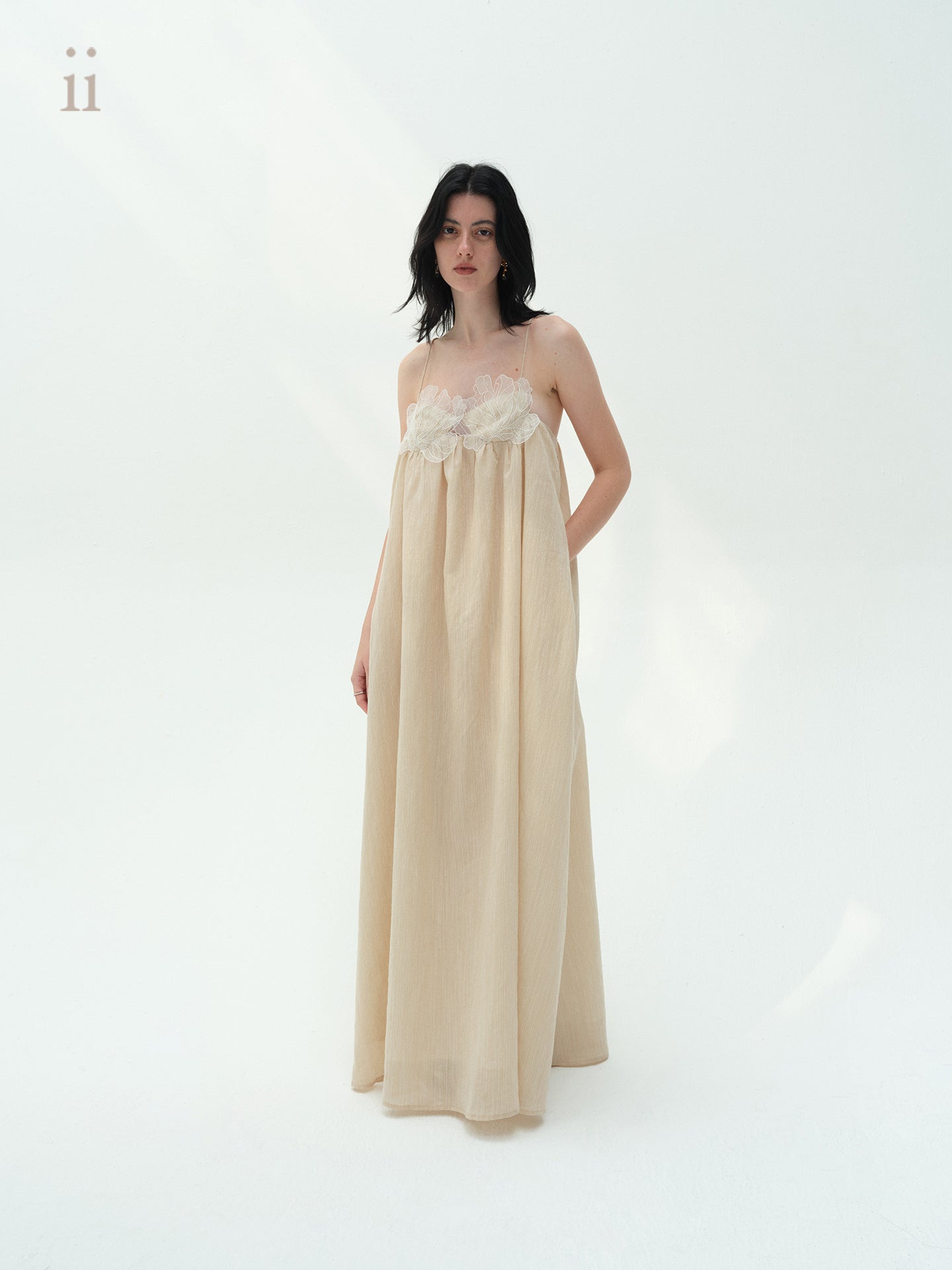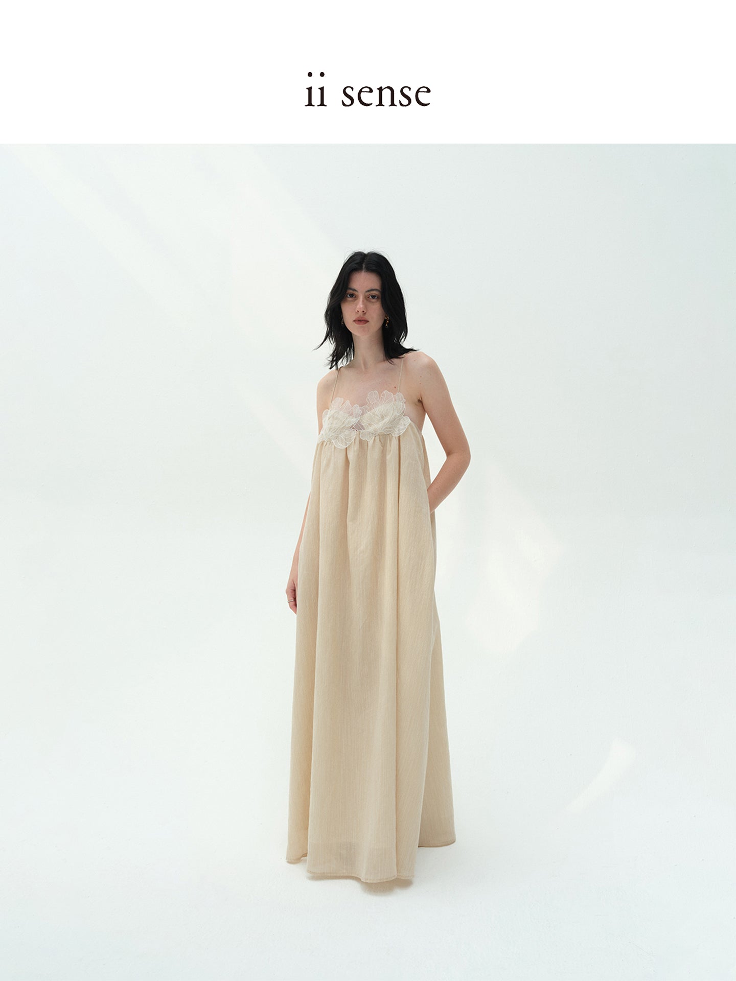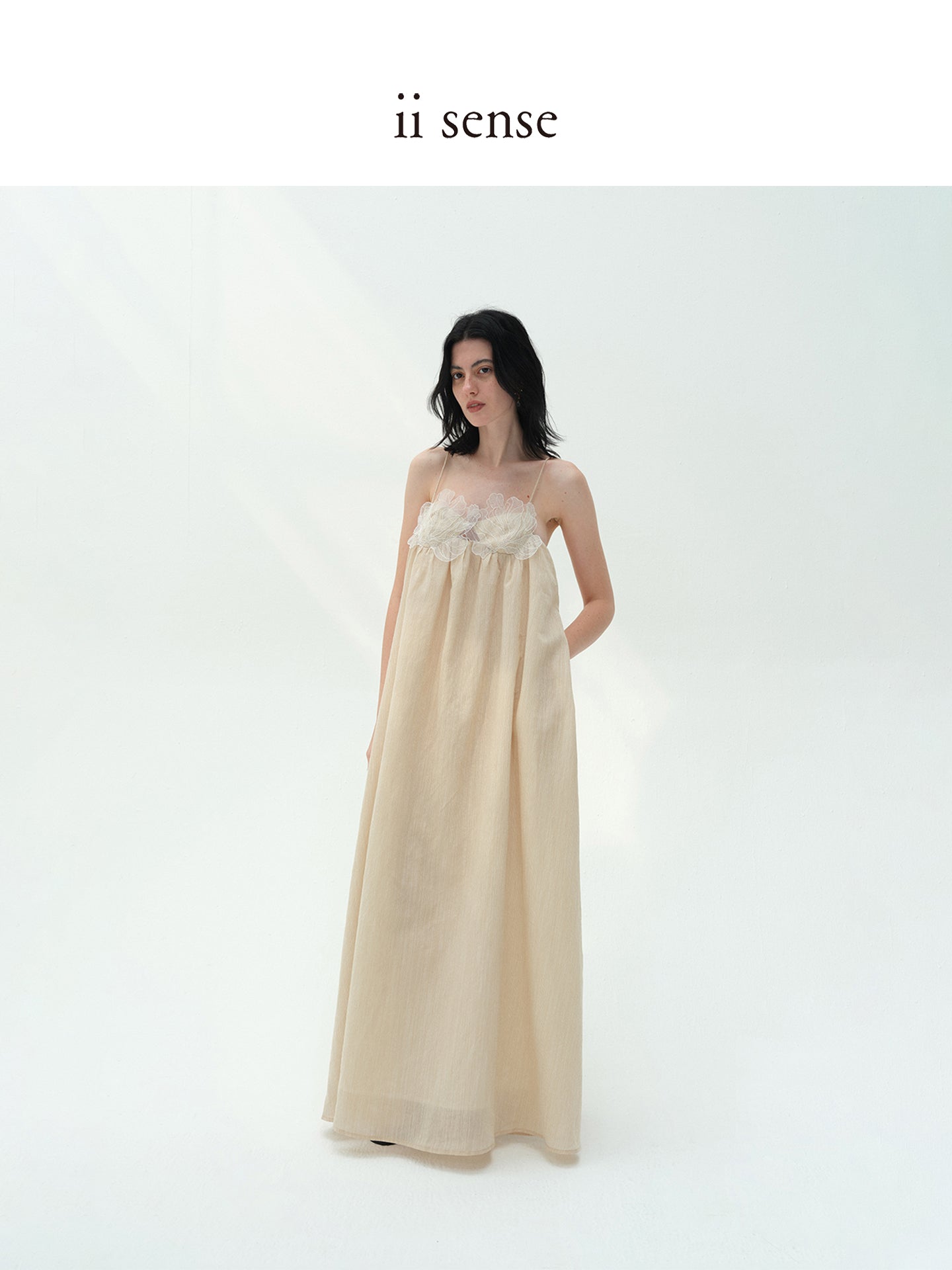 With its delicate iris lace accents and flowing pleated hem, this linen-blend slip dress evokes a sense of graceful movement and relaxed holiday serenity.